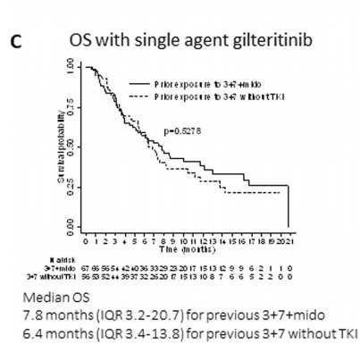该研究是一项回顾性研究,共入组167例R/R-AML患者,其中140例接受了吉瑞替尼单药治疗,67例R/R-AML患者在既往暴露过米哚妥林和“3+7”方案化疗,结果显示,即便既往暴露过上述治疗,在复发/难治的状态下接受吉瑞替尼治疗仍可获得与既往未接受米哚妥林治疗AML患者相似的缓解率,接受吉瑞替尼单药治疗的140例患者的客观缓解率(ORR)为30.8%,而既往暴露过米哚妥林治疗AML患者的ORR则为34%,中位生存(OS)分别为6.4个月vs7.8个月。因此该研究表明,既往暴露过米哚妥林或强化疗的复发/难治AML患者,仍然可以选择FLT3抑制剂吉瑞替尼单药治疗,获得的缓解率仍不亚于未接受过米哚妥林的患者,从真实世界结果的角度上证实了吉瑞替尼注册临床研究的疗效,为R/R-AML患者的治疗带来了选择和依据。