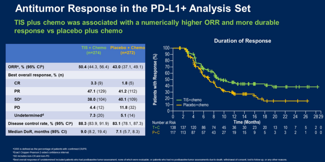 替雷利珠单抗联合化疗vs.单独化疗的ORR为50.4%(95%CI:44.3%~56.4%)vs.43.0%(95%CI:37.1%~49.1%)。在试验组,对治疗有反应的患者中,完全缓解率为3.3%,部分缓解率为47.1%;38.0%病情稳定,4.4%病情进展。试验组vs.对照组的DOR为9.0个月(95%CI:8.2~19.4)vs.7.1个月(95%CI:5.7~8.3)。此外,替雷利珠单抗联合化疗组vs.单独化疗组的DCR为88.3%(95%CI:83.9%~91.9%)vs.83.1%(95%CI:78.1%~87.3%)。