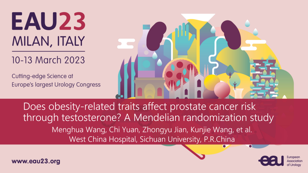 第38届欧洲泌尿外科学会年会(EAU23)于2023年3月10日至13日在世界时尚之都意大利米兰召开。EAU年会是欧洲乃至全球最受关注的泌尿外科会议之一,每年吸引全球1万5千余名泌尿外科专家参会。本次大会上,四川大学华西医院袁驰医生汇报的一项孟德尔随机化研究表明,血清睾酮可以介导BMI对前列腺癌风险的影响。