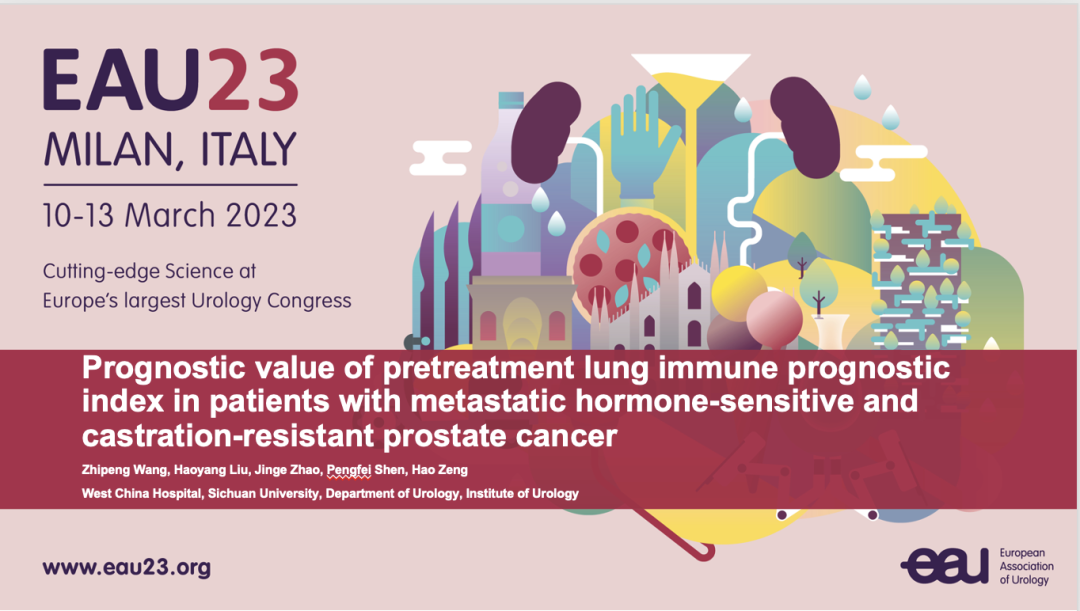 第38届欧洲泌尿外科学会年会(EAU23)于2023年3月10日至13日在世界时尚之都意大利米兰召开。EAU年会是欧洲乃至全球最受关注的泌尿外科会议之一,每年吸引全球1万5千余名泌尿外科专家参会。本次大会上,四川大学华西医院张兴明医生(第一作者为华西医院王志鹏医生)代表课题组汇报的一项研究表明,治疗前的肺免疫预后指数(LIPI)对于转移性激素敏感性前列腺癌(mHSPC)和去势抵抗性前列腺癌(mCRPC)患者具有很好的预后价值,有望成为前列腺癌的生物标志物。