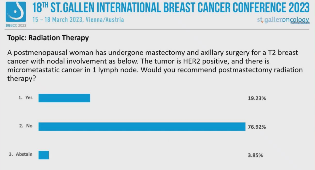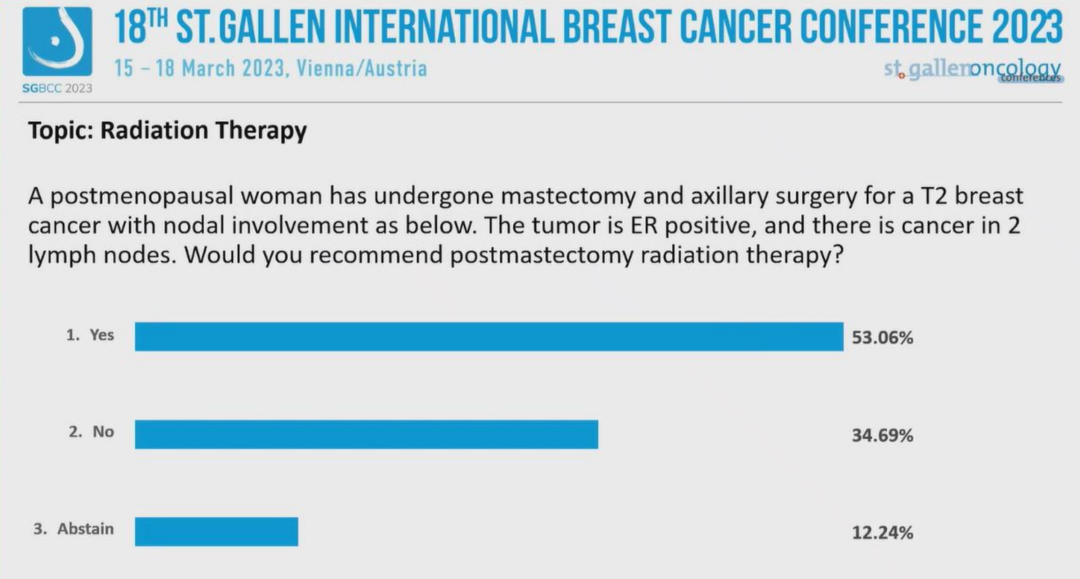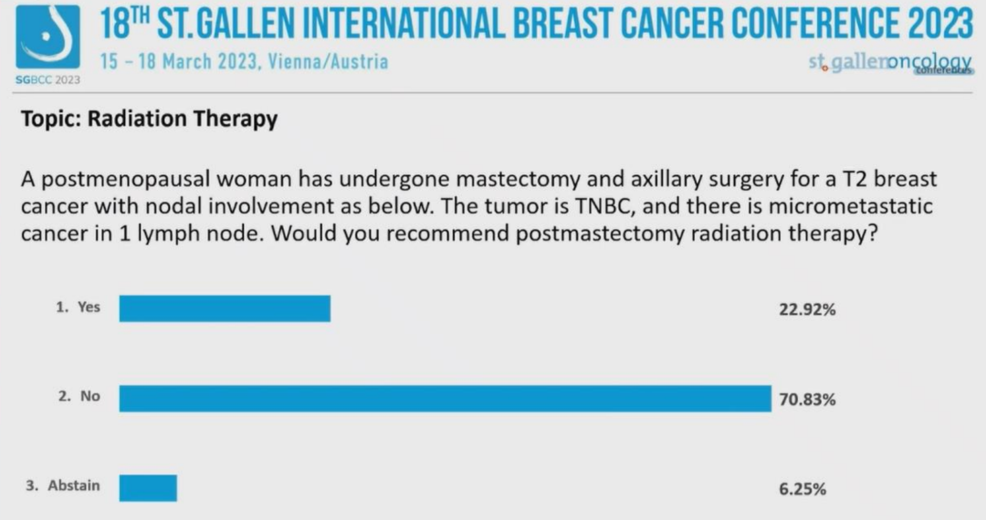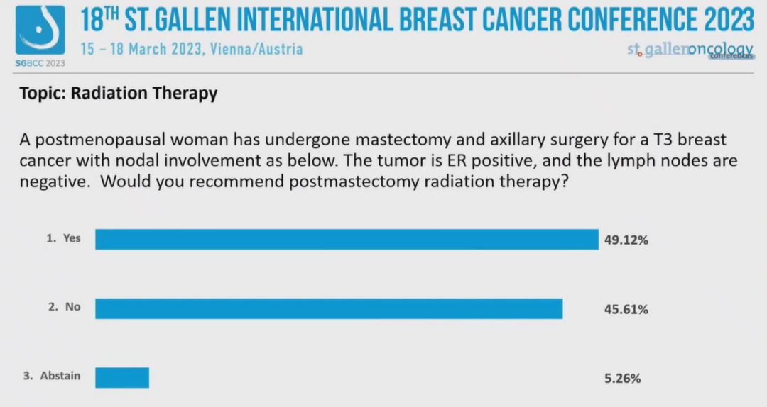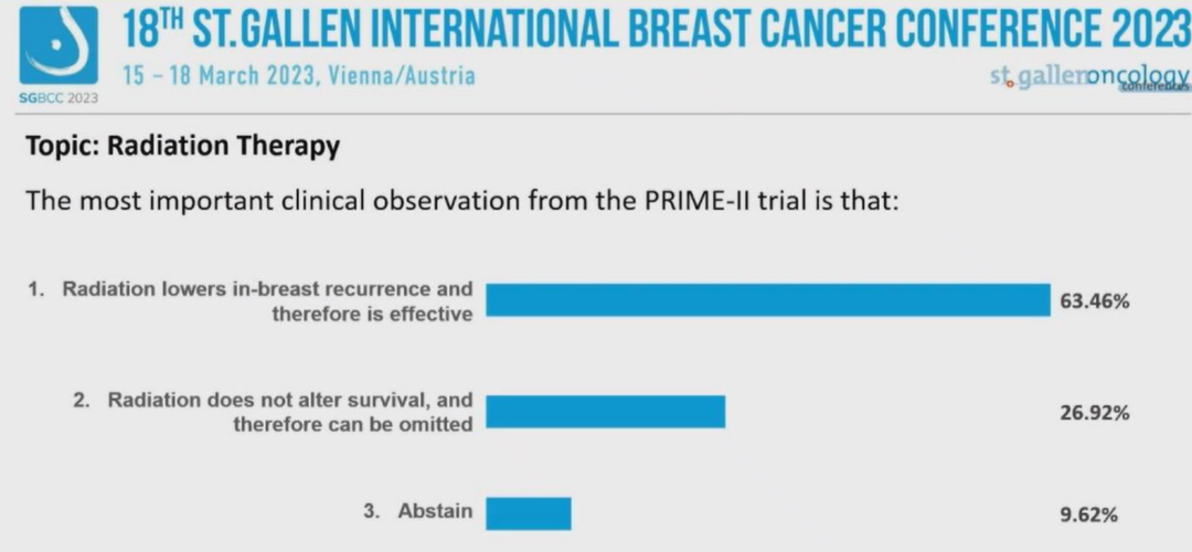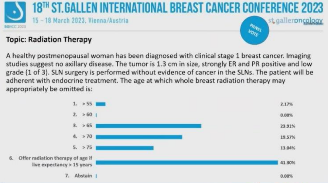 第18届St.Gallen国际乳腺癌大会(SGBCC 2023)于当地时间2023年3月15~18日在“世界音乐之都”维也纳举行。SGBCC汇聚全球各地的乳腺癌意见领袖,围绕最前沿、最具争议的早期乳腺癌诊治话题展开讨论和投票,形成每两年一更新的St.Gallen早期乳腺癌国际专家共识。大会的最后一天,专家投票压轴登场。《肿瘤瞭望》整理了早期乳腺癌放疗部分的专家投票如下。