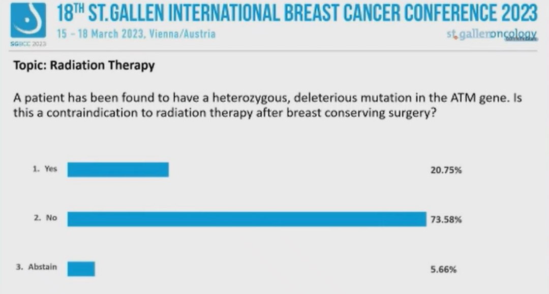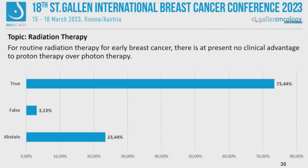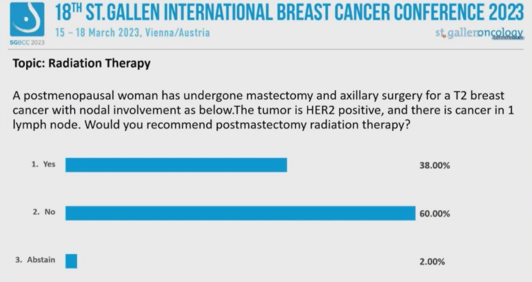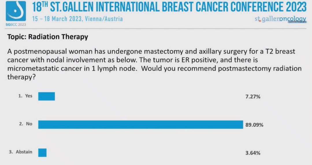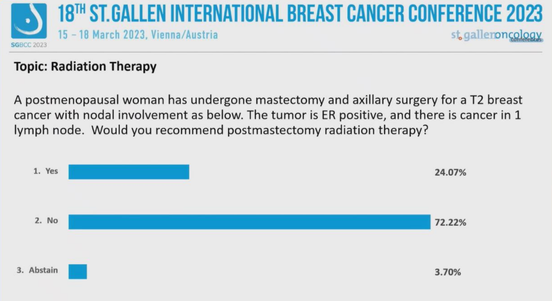 第18届St.Gallen国际乳腺癌大会(SGBCC 2023)于当地时间2023年3月15~18日在“世界音乐之都”维也纳举行。SGBCC汇聚全球各地的乳腺癌意见领袖,围绕最前沿、最具争议的早期乳腺癌诊治话题展开讨论和投票,形成每两年一更新的St.Gallen早期乳腺癌国际专家共识。大会的最后一天,专家投票压轴登场。《肿瘤瞭望》整理了早期乳腺癌放疗部分的专家投票如下。