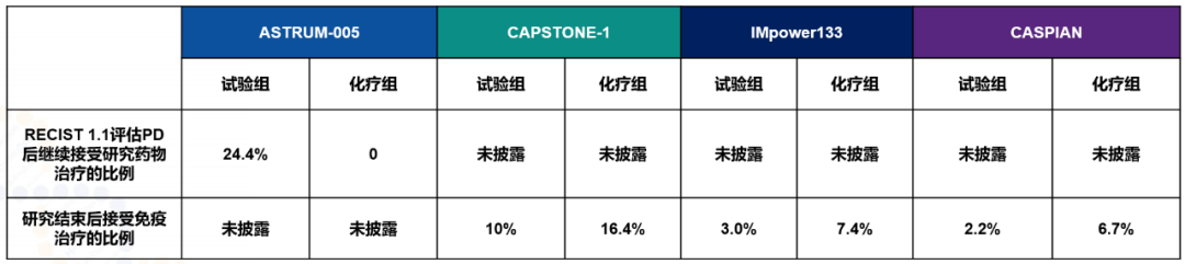 因为免疫治疗存在假性进展的可能,所以ASTRUM-005,IMpower133,CASPIAN和CAPSTONE-1研究Protocol中都有继续接受研究药物治疗的规定:即经RECIST v1.1评估PD(疾病进展),但研究者认为受试者仍可能从研究药物中获益,则继续接受研究药物治疗。