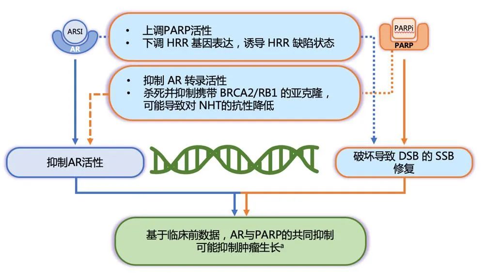在PARP抑制剂的基础上联合NHT可以起到“1+1>2”的作用。首先,NHT对AR的阻断可导致HRR组分下调同时上调PARP酶的活性,在诱导HRR缺陷表型的同时增强DNA损伤检测和修复,从而提高PARP抑制剂的效果4-9。与此同时,PARP抑制剂也能够扩大NHT的获益——PARP酶是AR转录机制的关键组分,能够促进AR募集到细胞核、增强AR活性,因此抑制PARP酶会间接抑制AR功能8-10
