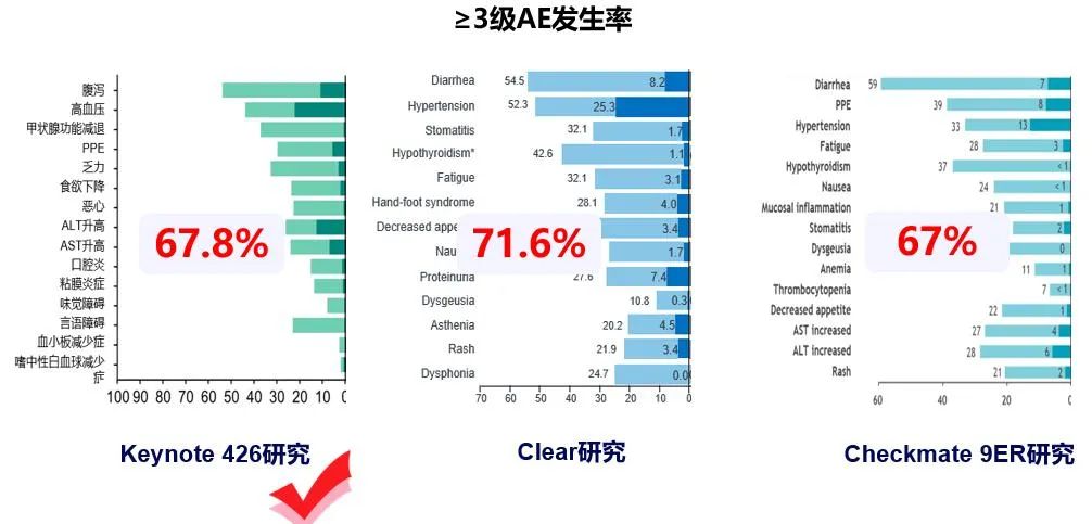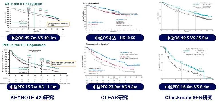 疗效:尽管不同研究之间无法进行头对头的直接比较,但通过间接比较还是可以发现,以仑伐替尼为基础CLEAR研究获得的PFS与OS获益更为显著,而以阿昔替尼为基础的KEYNOTE 426研究与以卡博替尼为基础的CheckMate 9ER研究的疗效基本相当。