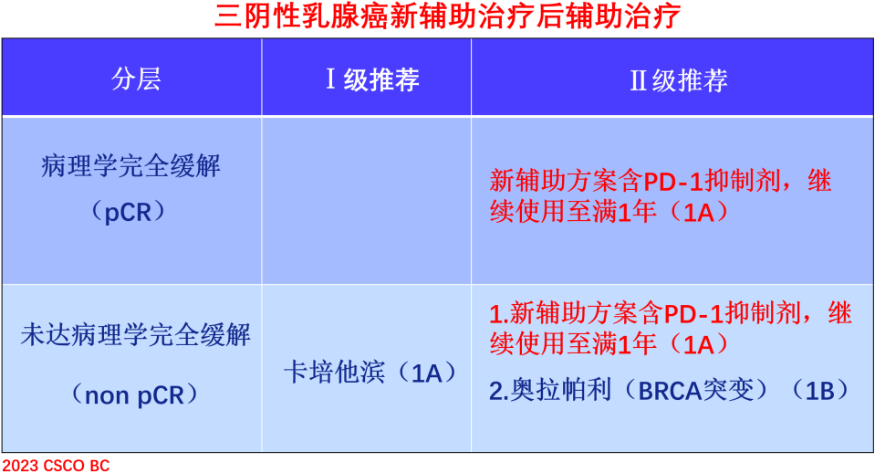 同样基于已发布的III期临床研究的结果以及国内获批适应症,2023版CSCO BC指南也升级了经PD-1抑制剂新辅助治疗患者术后PD-1单抗单药辅助治疗满1年的推荐(无论是否达到术后完全病理缓解pCR)至Ⅱ级,证据级别由2B调整为1A。