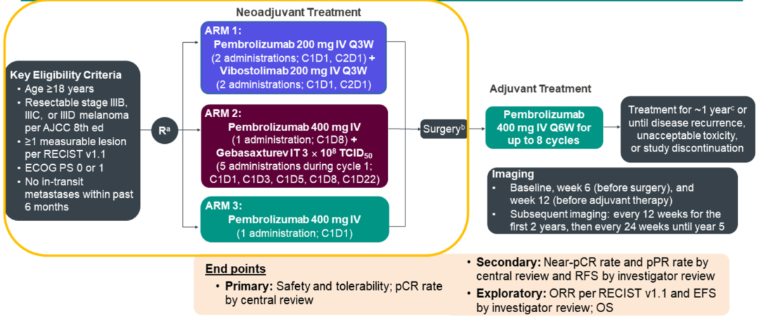 研究背景:溶瘤病毒疗法已有T-VEC获批FDA。V937是另一种在研的小RNA溶瘤病毒(野生型柯萨奇病毒A21),既往1期研究显示联合抗CTLA-4有良好的抗肿瘤活性。已有众多T-VEC联合PD-1的研究报道(点击阅读:溶瘤病毒or Lag3单抗?谁是PD-1单抗的良配)。这项研究将探讨PD-1+TIGIT(Vibo)对比PD-1+V937(Geba)新辅助治疗的差异。