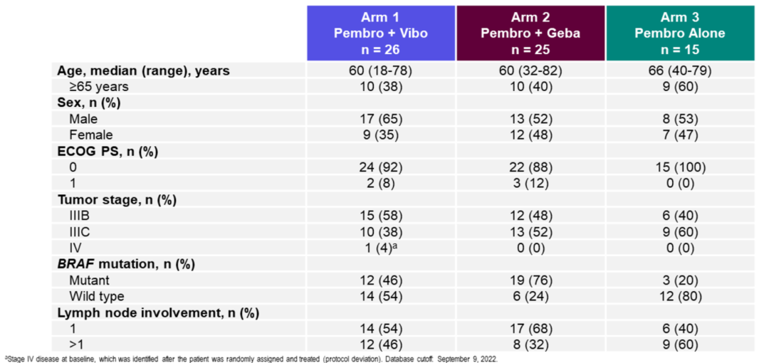 研究流程图:如图所示,各组各阶段入组人数在联合组相当,不是所有患者都完成了辅助治疗阶段。三组患者基线如图所示,PD-1+溶瘤病毒组的BRAF突变比例最高,单药组最低。