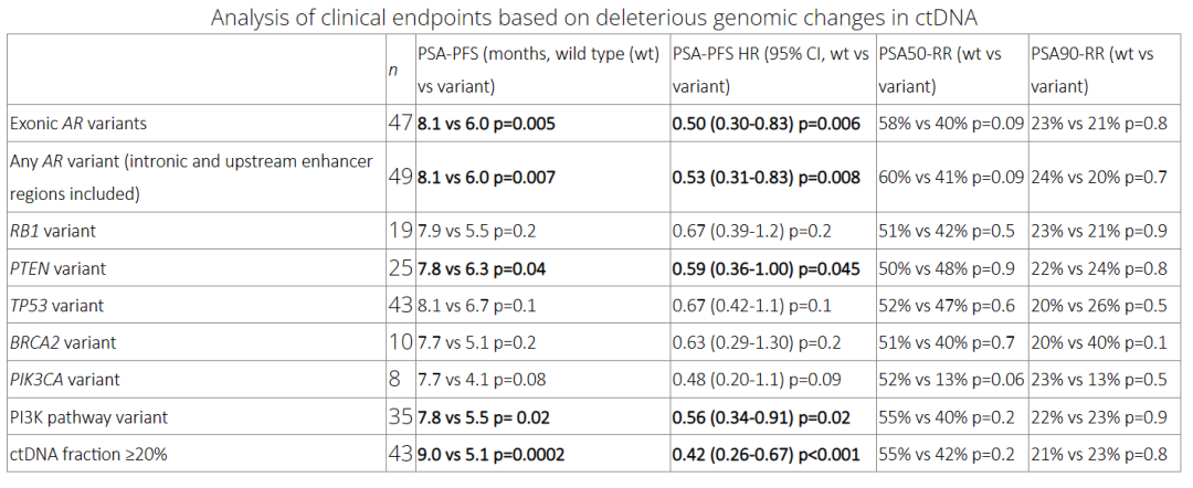 共有100例患者(中位年龄74岁,范围:52~90)接受了中位4个周期的LuPSMA治疗。83例患者可检测到ctDNA(中位分数17%,范围:0~94),PSA50-RR为50%,PSA90-RR为22%,中位PSA-PFS为7.2个月。有AR或PTEN异常的患者,其PSA-PFS明显缩短(HR分别为0.50和0.59;表1),有PI3K通路异常的患者同样如此(HR 0.56)。此外,高ctDNA负荷患者的PSA-PFS明显更差(HR 0.42)。基于有害的基因组改变,PSA-RR没有明显差异。