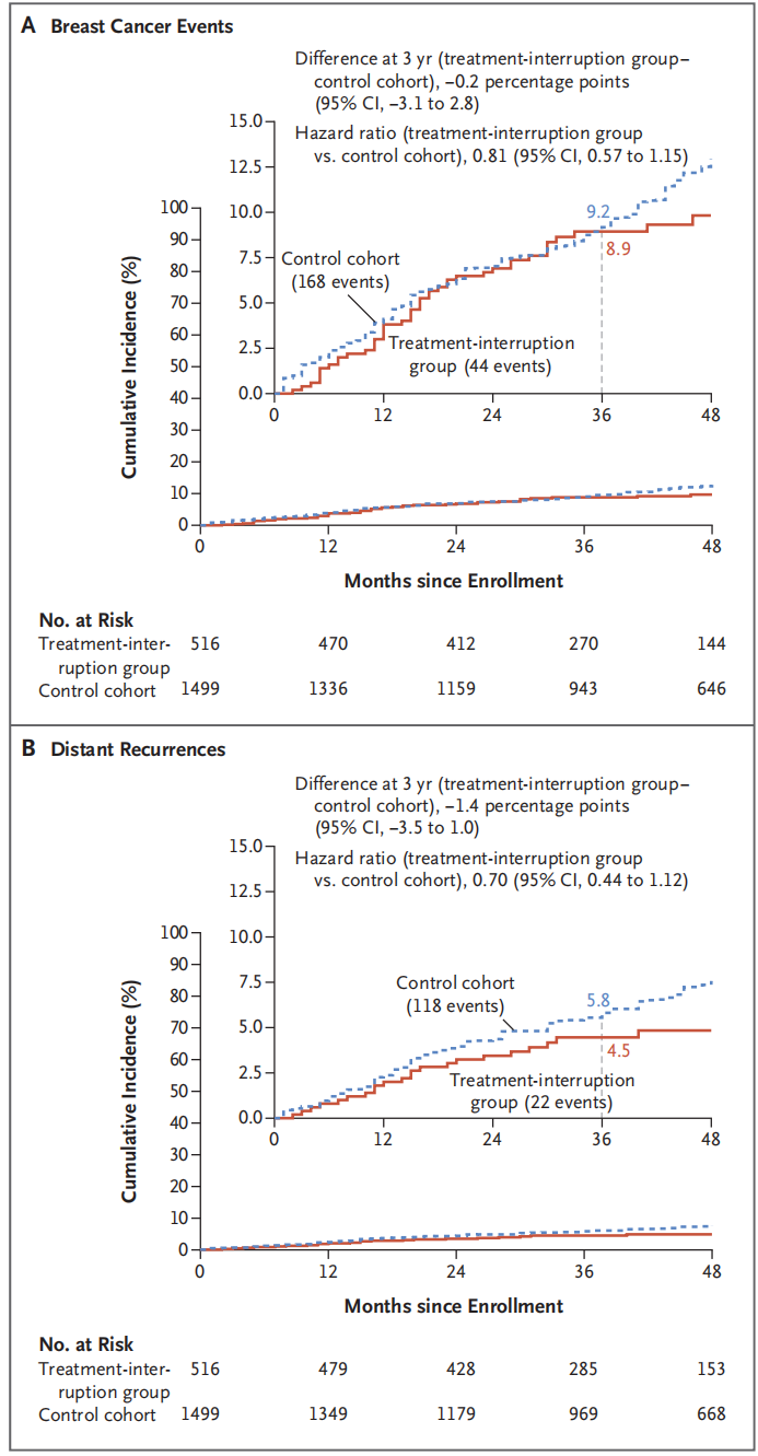 主要分析计划在1600例患者-年随访后进行。预设的安全阈值是在此期间发生46起乳腺癌事件。我们将这一治疗中断组的乳腺癌结局与外部对照队列(由符合本研究纳入标准的女性组成)中的乳腺癌患者结局进行了比较。