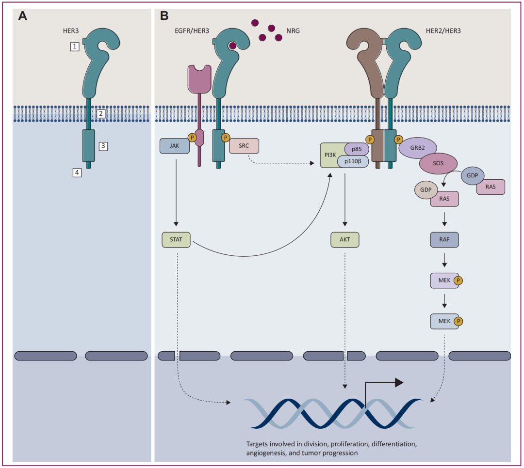 如下图所示,单体形式的HER3处于失活状态,但与配体NRG(神经调节蛋白)结合后发生构象变化,并与EGFR或HER2形成异源二聚体。随后,胞内结构域的酪氨酸激酶活性增强,启动不同的下游信号通路级联反应,包括PI3K/AKT、MAPK、JAK/STAT和SRC等信号通路;促进细胞分裂、增殖、分化以及血管生成等,导致肿瘤发生、发展和耐药性增加[2-3]。