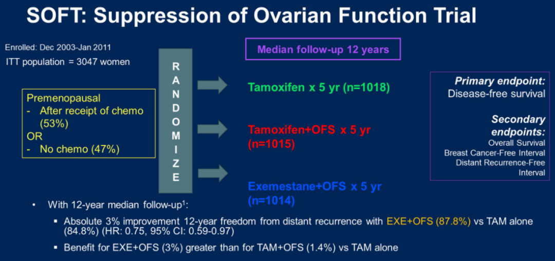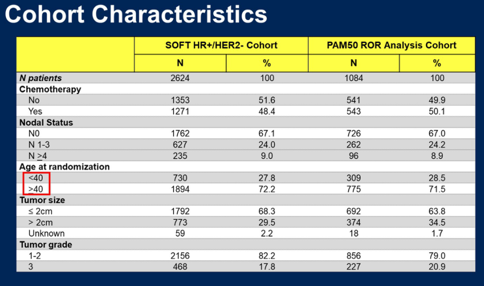 本次ASCO大会上报道了SOFT试验的二次分析结果——绝经前HR+/HER2-乳腺癌女性的PAM50内在亚型和ROR评分对于不同年龄段的年轻乳腺癌的预后价值和复发风险预测能力。SOFT是针对绝经前HR+/HER2-辅助内分泌治疗的一项研究,研究结果提示,与他莫昔芬单药辅助治疗相比,在他莫昔芬(T+OFS)或依西美坦(E+OFS)辅助内分泌治疗的基础上加用卵巢功能抑制(OFS)可降低复发风险。SOFT试验二次分析评估了PAM50亚型和ROR评分在一部分患者中的应用价值。