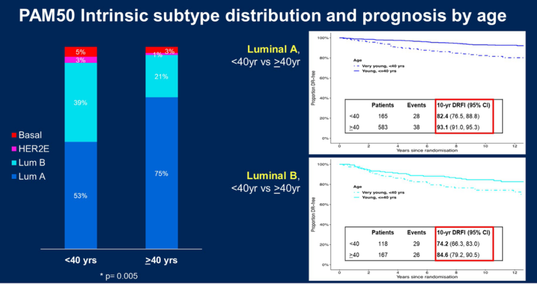 在该分析中,对于绝经前<40岁的患者定义为very young(非常年轻),≥40岁定义为young(年轻)。研究结果提示,<40岁和≥40岁的患者PAM50内在分子分型是明显不同的。例如,在<40岁的患者中,luminal A型患者占53%,luminal B型患者占39%,而≥40岁的患者中,luminal A型患者占75%,luminal B型患者占21%。