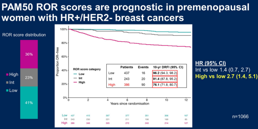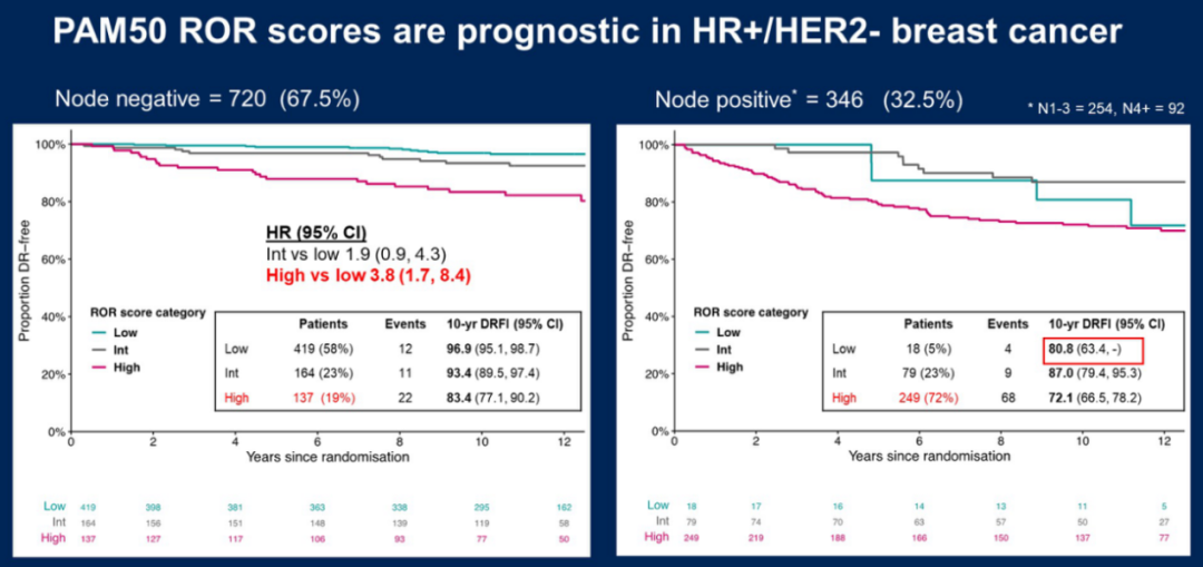 研究者根据PAM50 ROR评分将患者分为了高、中、低三类。整体来看,ROR评分越高,患者的复发风险也会越高:高ROR评分患者10年DRFI为76.1%(95%CI:71.8~80.7),中等ROR评分患者91.4%(95%CI:87.8~95.2),低ROR评分患者10年DRFI为96.2%(95%CI:94.3~98.2)。