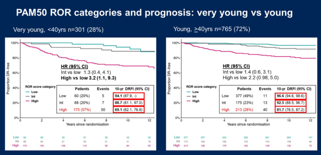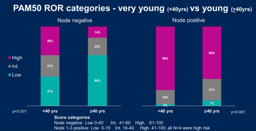 该研究揭示:1、<40岁的人群中luminal B型患者数量更多,预后相对更差。即使同样使用ROR评分进行矫正后,患者年龄对预后也有显著影响。2、PAM50基因检测结果在<40岁人群中与≥40岁人群中的复发风险有所不同,但通过ROR高、中、低评分,仍能有效区分不同年龄段患者的复发风险,显示PAM50评分基因检测在包括极年轻乳腺癌的年轻患者中应用,仍有较好的预后预测价值。