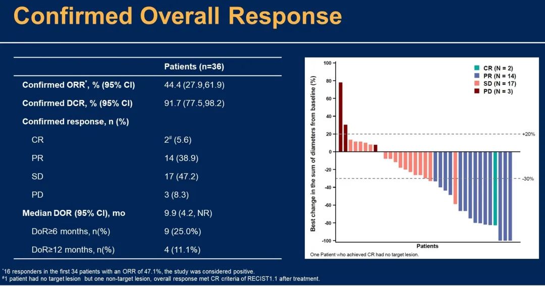 2020年1月20日至2022年10月14日期间,共纳入36例患者,中位年龄60岁(范围:29~76),其中17例(47.2%)患者美国东部肿瘤协作组体力状态(ECOG PS)评分为1分,15例(41.7%)患者既往至少接受过两次全身治疗。截至2023年1月16日,中位随访时间为14.0个月(四分位距:6.3~23.3)。所有36例患者均可评估疗效,经确认的ORR为44.4%(95%CI:27.9~61.9),经确认的DCR为91.7%(95%CI:77.5~98.2),其中完全缓解(CR)2例,部分缓解(PR)14例,疾病稳定(SD)17例。中位PFS为6.4个月(95%CI:5.3~13.0)。