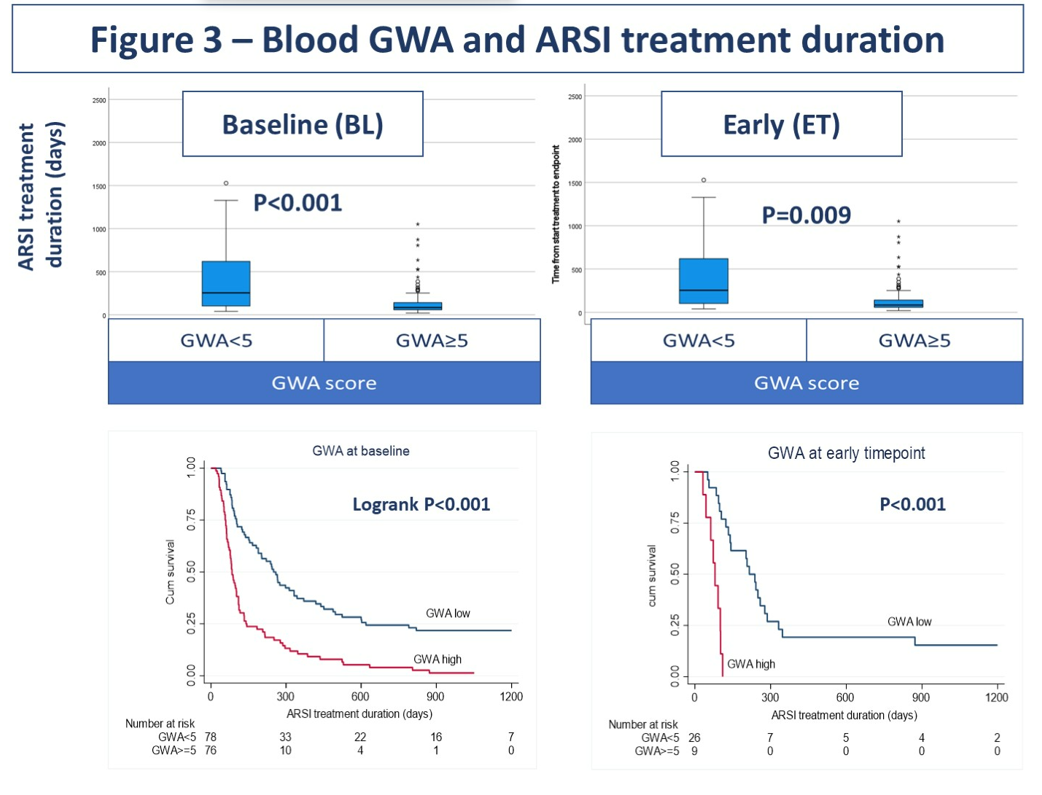 这项研究显示,基于cfDNA的mFAST SeqS全基因组非整倍体评分,可以作为mCRPC患者对AR通路抑制剂(ARSI)治疗反应的预测工具。基线、早期GWA<5的患者相较于GWA>5的患者有更好的生存获益。