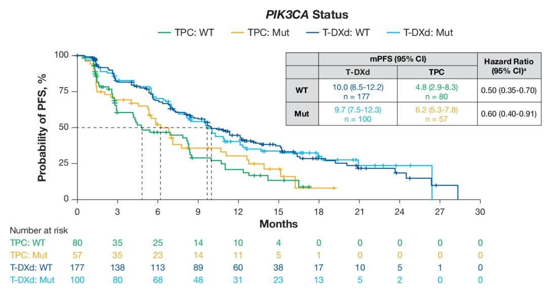 PIK3CA突变型(HR 0.50)、野生型(HR 0.60)患者均可从T-DXd治疗中相比TPC(研究者选择的治疗)增加获益;而且T-DXd治疗这两种PIK3CA状态患者的无进展生存期(PFS)相似(10.0 vs 9.7个月)。