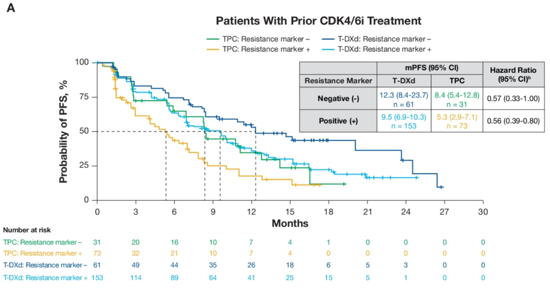 在未经CDK4/6i治疗的患者中,CDK4/6i耐药标志物阳性患者的PFS事件风险降低74%(HR 0.26),阴性患者(HR 0.55)也有较好的获益。值得注意的是,在未经CDK4/6i而初次接受T-DXd治疗的标志物阴性患者中,PFS长达17.9个月,预示T-DXd在前线治疗中可能有巨大应用潜力。