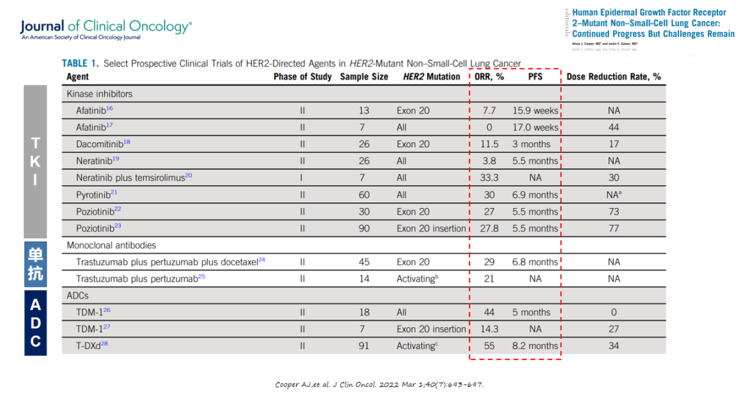 为突破HER2突变型肺癌的治疗困境,全世界对针对HER2突变型肺癌的多种药物进行了多项研究,TKI、单抗、ADC、免疫治疗等单药或联合治疗均显示出一定的疗效(见图1)[1],现在简要介绍一下各项研究。