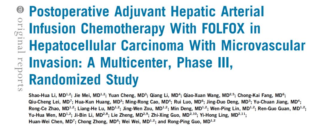 1、术后辅助性FOLFOX方案肝动脉灌注化疗(HAIC)在合并微血管侵犯的肝细胞癌患者中的疗效:一项多中心、Ⅲ期、随机对照临床研究