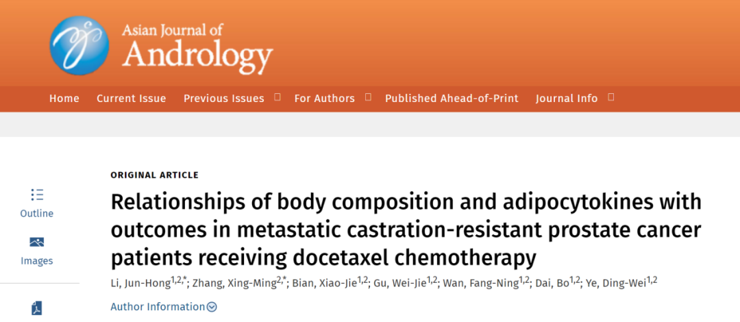 编者按:多西他赛仍是转移性去势抵抗性前列腺癌(mCRPC)患者的常用治疗方案;患者的营养状态和伴随疾病可能影响晚期患者的治疗决策。目前常用的营养状况评估指标包括体重指数(BMI)、骨骼肌和脂肪厚度等。近日,《亚洲男科学》(Asian Journal of Andrology)在线发表一项来自复旦大学附属肿瘤医院泌尿外科团队的研究,采用了更加客观的皮下脂肪指数(SATI)、内脏脂肪指数(VATI)、骨骼肌指数(SMI)以及血清脂肪细胞因子等指标,分析接受多西他赛治疗mCRPC患者的生存差异。该研究论文的第一作者为李俊宏博士,通讯作者为戴波教授和叶定伟教授。
