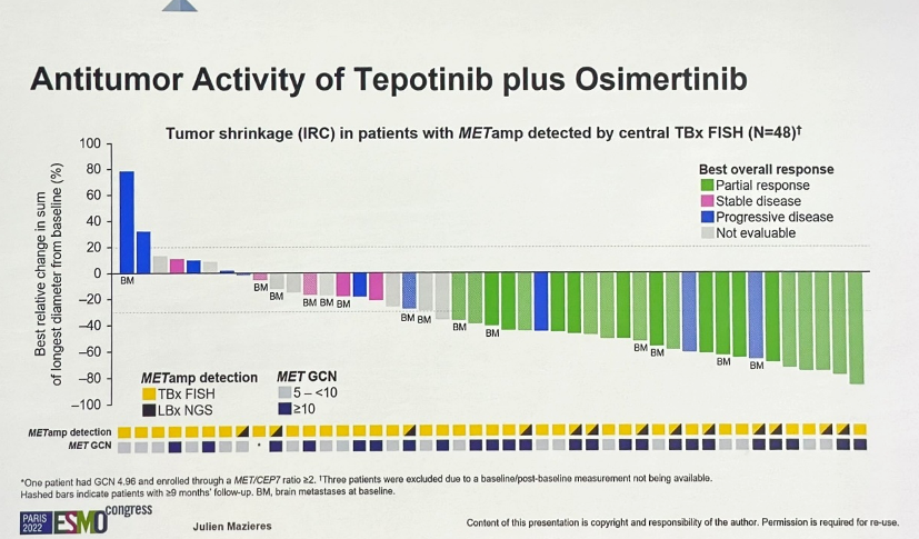 另一项Ib/II期研究评估了Capmatinib+吉非替尼治疗EGFR-TKI治疗失败后获得性耐药合并MET扩增或过表达患者的疗效,ORR为27%。