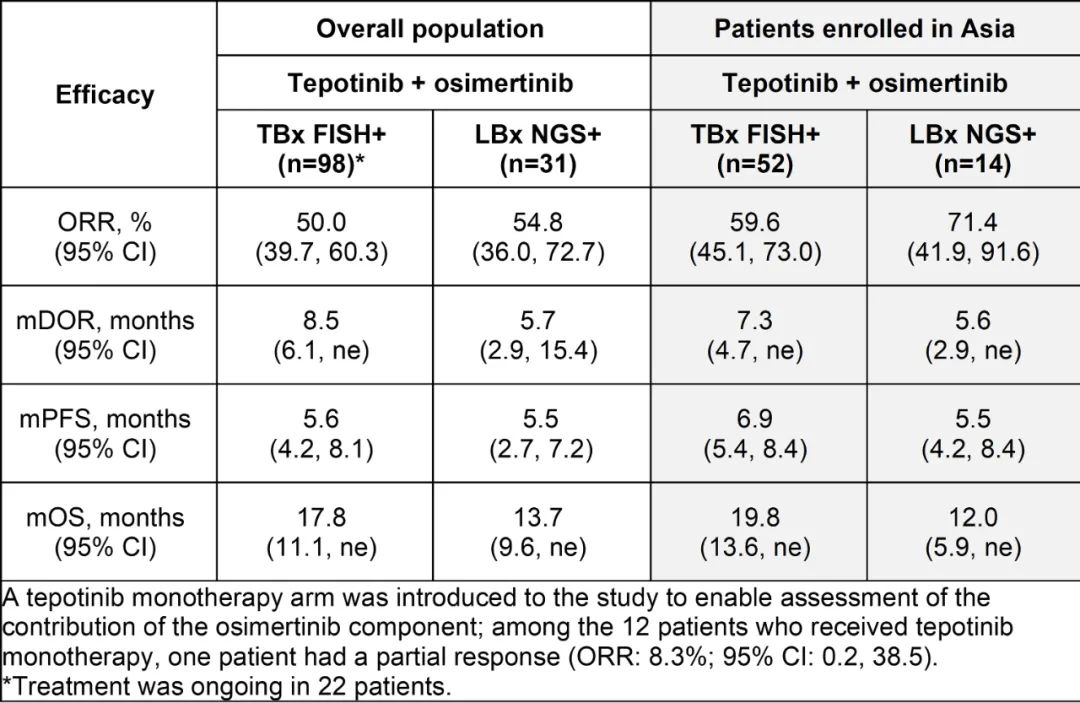 在98例FISH+MET扩增患者中,ORR为50.0%(95%CI:39.7-60.3),mDOR为8.5个月(95%CI:6.1-NE),mPFS为5.6个月(95%CI:4.2-8.1)。联合治疗组中76例患者来自亚洲,其中52例FISH+MET扩增患者ORR为59.6%(95%CI:45.1-73.0),mDOR为7.3个月(95%CI:4.7-NE),mPFS为6.9个月(95%CI:5.4-8.4)。