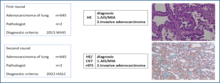 贴壁型腺癌及浸润性腺癌诊断在部分病例诊断中存在争议,其中一个比较重要的影响是对于微浸润腺癌前(包括原位腺癌及微浸润腺癌)和浸润性腺癌的鉴别诊断,因为即便少量的贴壁型腺癌和浸润间的诊断差异便可造成最终诊断的巨大差异。由于微浸润前病变具有完全良好的预后,所以精准的诊断对于患者的预后预期具有较大的影响。2022年IASLC浸润工作组对具有争议的贴壁型腺癌和浸润的区分提出了自己新的方案。我们按照该方案标准对本院肺腺癌进行重新诊断,以确定该方案在实际应用中的价值。