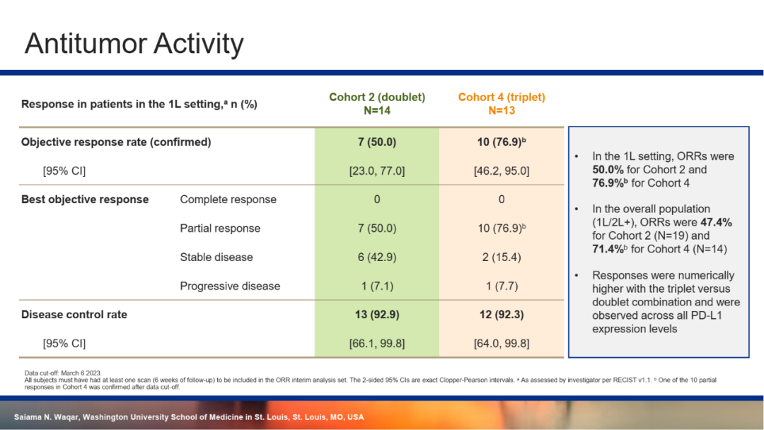 全人群中(一线及二线和二线以上治疗)的疗效结果:队列2和4的ORR分别为47.4%和71.4%。本次发布结果初步显示,无论是否联合化疗,Dato-DXd联合度伐利尤单抗都呈现很好的治疗效果,并且在所有PD-L1表达水平的患者中均观察到缓解。