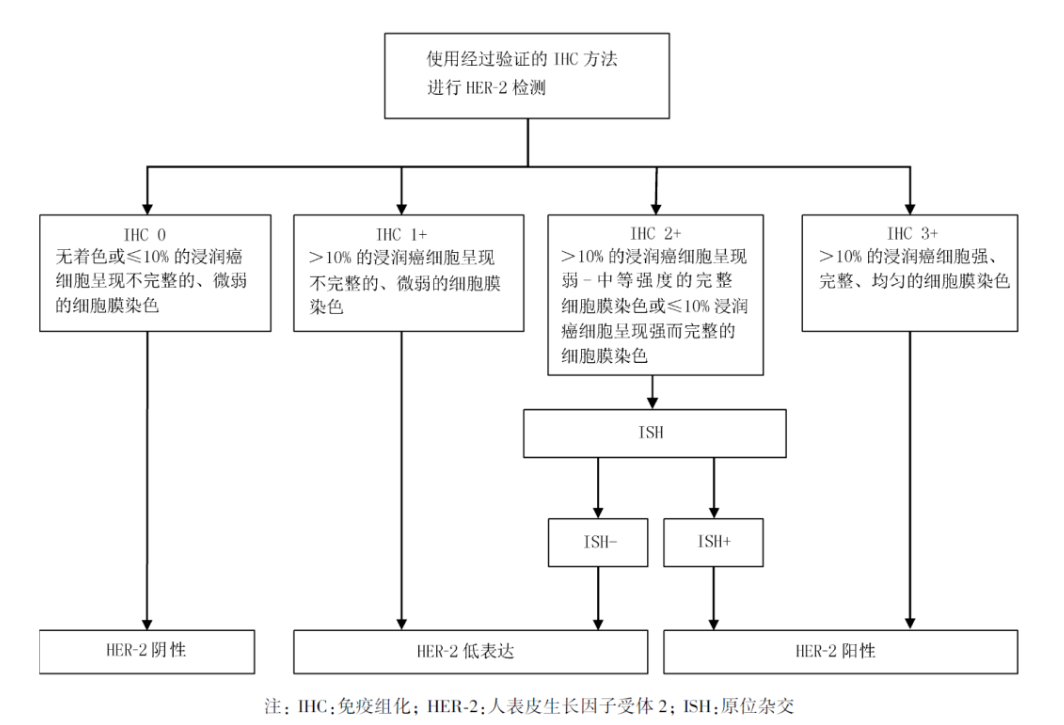 其中IHC 1+是指HER2 IHC检测显示>10%的浸润癌细胞呈现不完整的、微弱的细胞膜染色;而IHC 2+/ISH-是HER2 IHC检测显示>10%的浸润癌细胞呈现弱-中等强度的完整细胞膜染色或≤10%浸润癌细胞呈现强而完整的细胞膜染色,且ISH检测呈阴性。