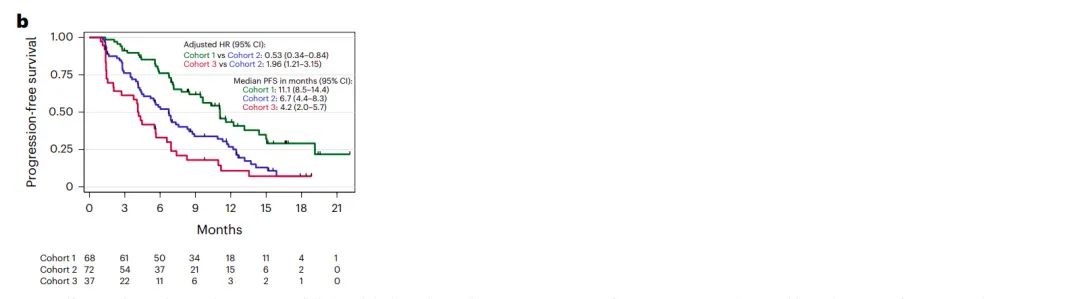 中位随访15.6个月(95%CI:12.6~16.7)。队列1的中位PFS为11.1个月(95%CI:8.5~14.4),队列2为6.7个月(95%CI:4.4~8.3),队列3为4.2个月(95%CI:2.0~5.7,图3b)。
