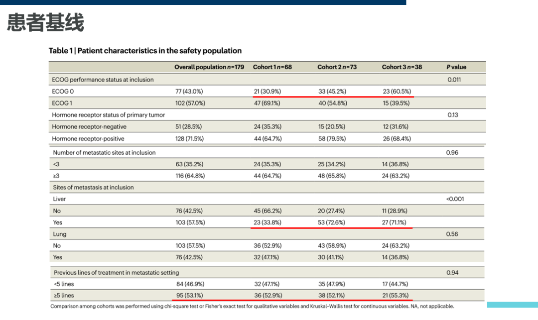 针对入组患者基线情况,队列1、2、3中分别有64.7%、79.5%、68.4%的患者为HR+。大多数患者(53.1%)在转移性疾病阶段接受了≥5线的既往治疗。相比于队列2、3,队列1的患者出现肝转移的情况较少(33.8%)。队列1、2、3中分别有30.9%、45.2%、60.5%的患者ECOG评分为0。除了转移部位及体能状况外,患者特征在各队列中是均衡的。