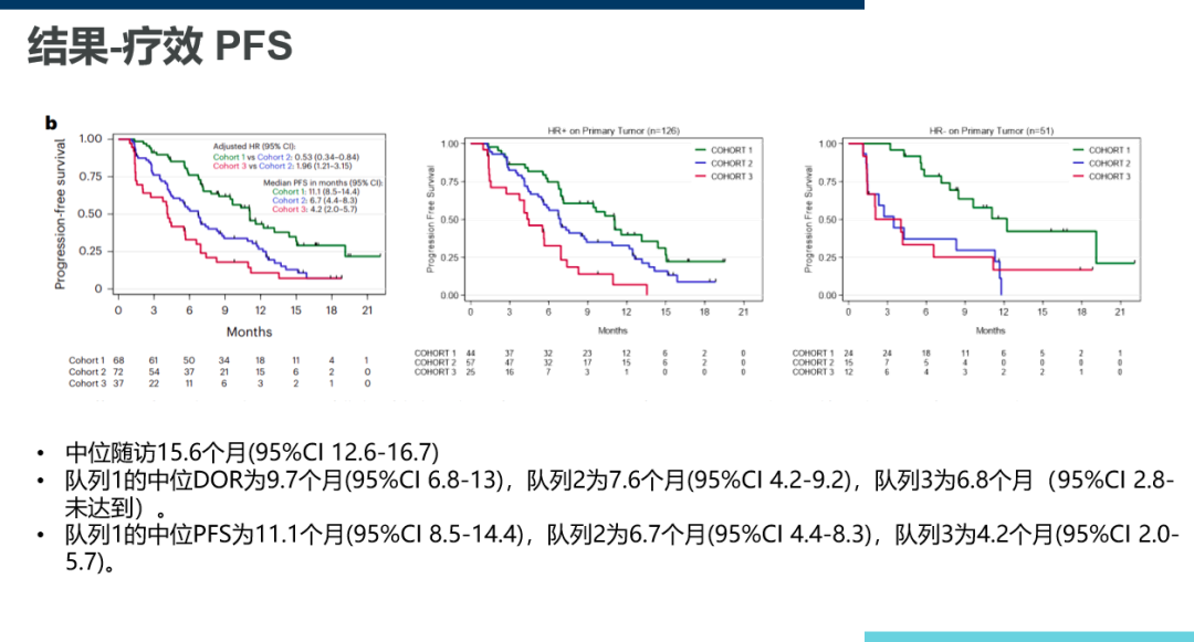 中位随访15.6个月(12.6-16.7)后,队列1的中位PFS为11.1个月(8.5-14.4),队列2的中位PFS为6.7个月(4.4-8.3),队列3的中位PFS为4.2个月(2.0-5.7)。中位随访14.1个月(13.2-15.2)后,队列1(16.7-未达到)、2(11.5-未达到)、3(8.3-17.3)的中位OS均未达到。CBR在队列1、2、3中分别为85.3%、56.9%、35.1%。