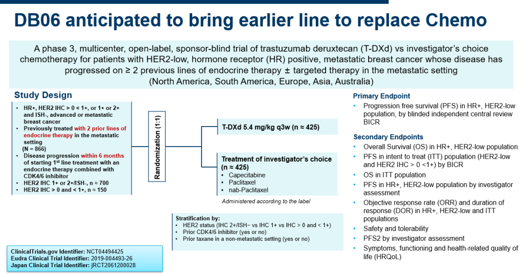 [5]A phase 3,randomized,multi-center,open-label study of trastuzumab deruxtecan(T-DXd)versus investigator’s choice chemotherapy in HER2-low,hormone receptor positive breast cancer patients whose disease has progressed on endocrine therapy in the metastatic setting(DESTINY-Breast06).https://clinicaltrials.gov/ct2/show/NCT04494425
