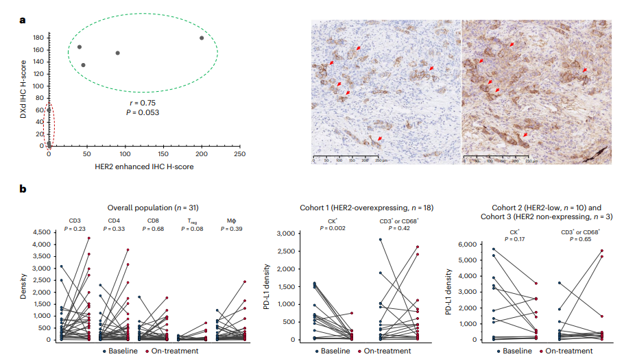 采用7例同时具有基线活检标本和治疗中标本(baseline and D2-D4 c1),分析药物分布研究结果显示:肿瘤细胞的HER2的高表达水平和T-DXd强染色之间存在中度关联。对来自3个亚组31例患者(baseline and D22-D43 c1)分析T-DXd对于免疫微环境的影响,没有观察到治疗前后在整体人群中对于微环境整体产生显著性改变。对于HER2过表达的患者,T-DXd可明显减少PD-L1表达,主要考虑细胞毒效应(n=18,P=0.002)。