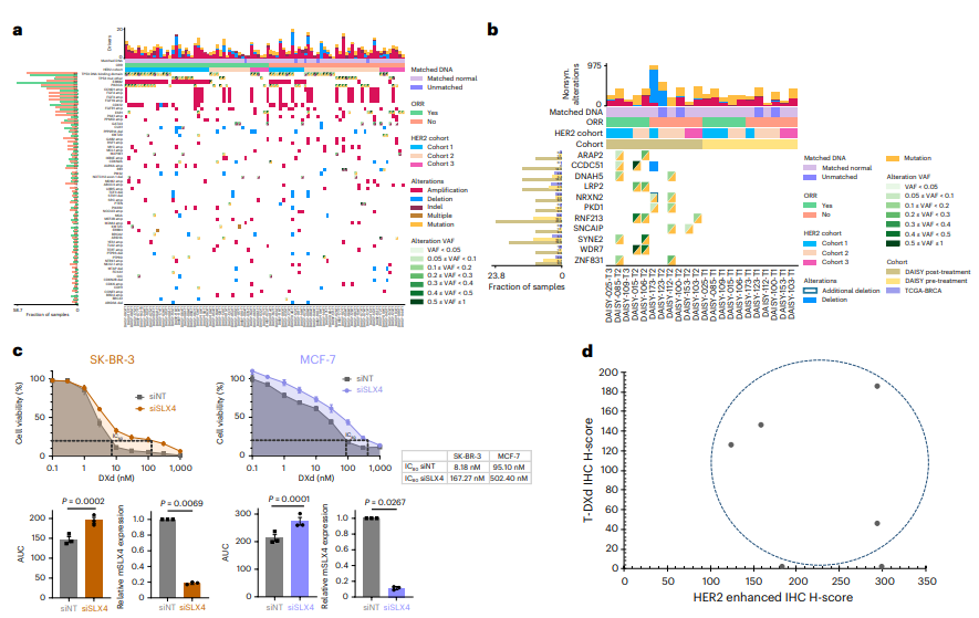 为确定T-DXd原发性和继发性耐药机制,研究者对基线时【89例患者(cohort 1:38例,cohort 2:37例,cohort3:14例)】及耐药时【21例患者:cohort 1(5例),cohort 2(11例),cohort 3(5例)】获得的冷冻肿瘤组织进行了全外显子组测序(WES)。其中11对耐药活检样本与基线样本相匹配。除了ERBB2扩增,没有观察到驱动基因改变与前期耐药之间的显著相关性(经FDR校正的P>0.54)。基线时89例患者中有6例(7%)检测到ERBB2半合子缺失。其中4例患者对T-DXd无应答(队列2中3例,队列3中1例)。通过比较在基线和耐药时获得的11对活检样本的基因组图谱,探索在耐药时获得了哪些基因组改变。对于11例患者进行耐药性分析(匹配基线标本和药物耐药后标本进行WES测序)检测到11个基因突变(在基线是不存在突变,在耐药后在2个以上的患者中检测到发生突变的)。值得注意的是,在耐药后21例标本中共检测3例出现SLX4突变,且被CADD和SIFT定义为有害突变。SLX4编码一种调节结构特异性核酸内切酶的DNA修复蛋白;在SK-BR-3和MCF-7两株乳腺癌细胞中,沉默SLX4基因能够大幅降低T-DXd处理后的细胞活性;且由于SLX4缺失,导致DXd(IC80)所需浓度提高近20倍,提示SLX4突变可能与T-DXd耐药有关。