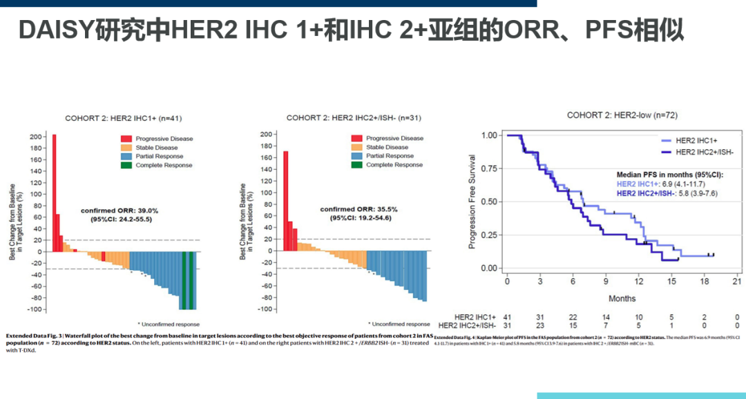在HER2低表达患者中,DB-042试验的中位PFS略高于DAISY研究(9.9个月vs 6.7个月)。两项研究中既往治疗线数(DB-04研究既往中位治疗线数为3 vs DAISY 5线)存在差异。此外,HR+患者的比例(89%vs 79%)、一般状况评估(ECOG 0:54%vs 45%)0均存在差异,这可能解释了这两项研究结果的不同。