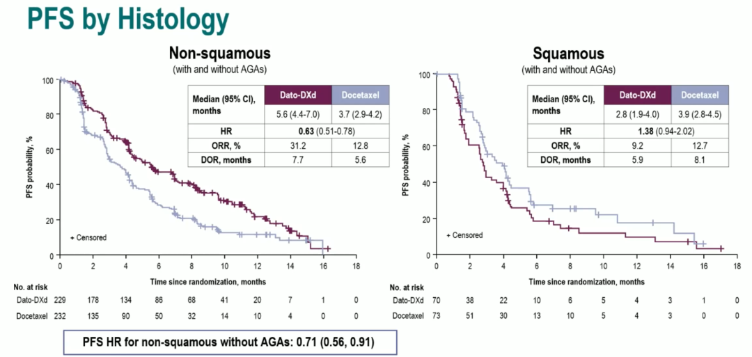 共有604例患者(Dato-DXd组299例,多西他赛组305例)纳入全分析集(FAS),Dato-DXd组和多西他赛组分别有43.1%和42%既往接受过≥2线全身治疗;分别有78%和77%的肿瘤组织学为非鳞NSCLC(nsq-NSCLC),22%和23%为鳞状NSCLC(sq-NSCLC);两组患者均有17%携带AGA;