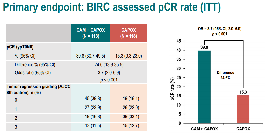 BIRC评估的pCR率(ITT)。CAM+CAPOX组39.8%(95%CI:30.7~49.5)的患者达到pCR,而CAPOX组为15.3% (95%CI:9.3~23.0),两组间的OR(Odds ratio)为3.7(95%CI:2.0~6.9,P<0.001),CAM+CAPOX组的pCR率显著优于CAPOX组,差异具有统计学意义。