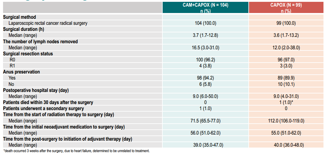 研究共纳入231例患者,113例患者被随机分配到CAM+CAPOX组,118例患者被随机分配到CAPOX组,至数据截止日期2023.07.11,CAM+CAPOX组中112例患者接受了新辅助治疗(107例完成),104例已手术,8例未手术(3例拒绝,2例达到cCR,1例死亡,1例不可切除,1例失访),在接受手术治疗的104例患者中,81例已停止治疗(39例主动要求,36例研究者决定,2例疾病进展,1例因不良事件,1例死亡,1例失访,1例方案违背),26例患者仍在接受治疗;CAPOX组中115例患者接受了新辅助治疗(109例完成),99例已手术,16例患者未手术(7例拒绝,4例达到cCR, 3例撤回同意,2例疾病进展),在接受手术治疗的99例患中,68例患者停止治疗(23例主动要求,22例研究者决定,15例完成治疗,4例疾病进展,3例撤回同意,1例死亡),34例患者仍在接受治疗。