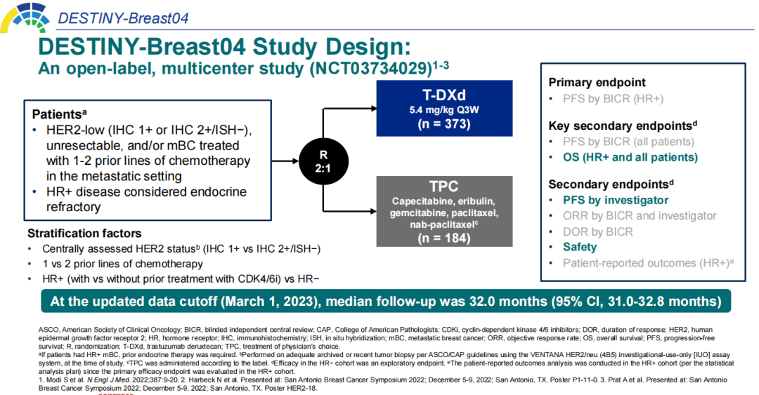 DESTINY-Breast04(DB-04)研究在HER2低表达(IHC 1+或2+,ISH-)转移性乳腺癌患者中对比了T-DXd与TPC的疗效差异。截至初步分析数据截止日期(DCO,2022年1月11日),全分析集(FAS,HR+和HR-)患者中位随访18.4个月后结果显示,T-DXd组和TPC组患者的中位总生存(OS)期分别为23.4个月vs 16.8个月(HR 0.64;P=0.001)。本次大会公布了DESTINY-Breast 04研究的预设进一步随访(截止日期为2023年3月1日)分析结果。截至数据截止日期的结果更新包括:研究者评估的OS(HR+患者和FAS患者)、无进展生存期(PFS)以及患者的安全性。