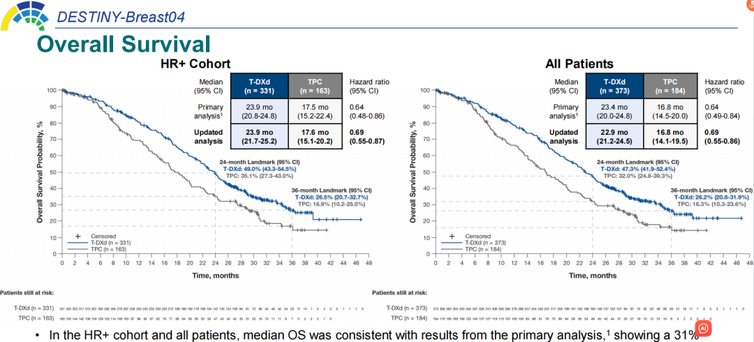 截至2023年3月1日,患者的中位随访时间为32个月。T-DXd组和TPC组患者的中位治疗持续时间分别为8.2个月(范围:0.2个月~39.1个月)vs 3.5个月(范围:0.3个月~19.7个月)。总生存数据显示,在HR阳性患者中,T-DXd vs TPC组:23.9个月(95%CI:21.7~25.2)vs 17.6个月(95%CI:15.1~20.2)(HR 0.69,95%CI:0.55~0.87)。所有患者中,T-DXd vs TPC组:22.9个月(95%CI:21.2~24.5)vs 16.8个月(95%CI:14.1~19.5)(HR 0.69,95%CI:0.55~0.86);死亡风险均降低31%。