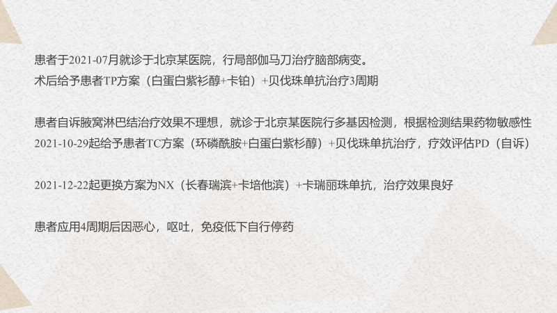 1.之所以没选择化疗联合免疫抑制剂,一是患者没有做PD-L1水平检测,即使做了,也有CPS≥10的要求(KEYNOTE-355研究)。另外对于无病间期特别短,比如那些耐药的病人,可能即使我们应用了免疫治疗,整体的有效率也是比较差的。