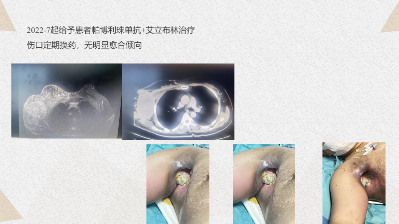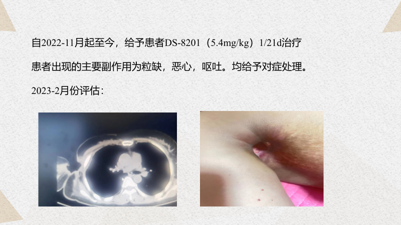 杨华教授:回顾整个病程,从21年6月患者确诊以来,两年的时间里经历了非常艰难的一系列治疗:21年7月份在TA新方案之后出现了脑转移,局部伽玛刀治疗后更换为TP+贝伐珠单抗。后续基因检测后,更换为TC+贝伐珠单抗,疗效不理想,则进一步使用了NX+卡瑞利珠单抗治疗了4个周期,但因副作用而停药。22年7月又出现了腋窝淋巴结的进展并且破溃,继而更换为艾立布林+帕博利珠单抗但效果不理想。从22年11月开始使用DS-8201(T-DXd,德曲妥珠单抗)至今。我们可以从患者有限的影像学的资料中看到一个相对理想的效果,可以说DS-8201(T-DXd,德曲妥珠单抗)给患者提供了新的疗效升级。