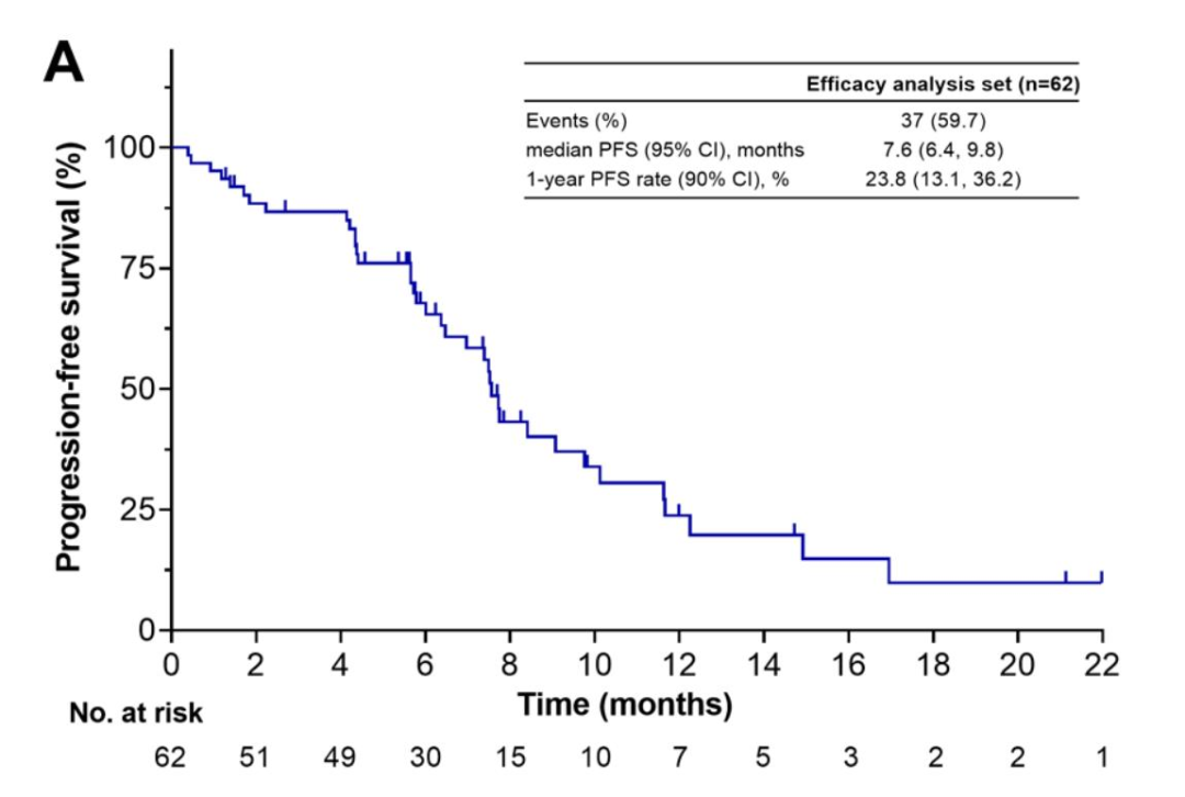 研究结果:从2020年7月至2021年12月,共计69例患者入组。至2022年7月,中位随访时间8.2个月,62例患者纳入疗效分析,1年PFS率为23.8%(90%CI,13.1%-36.2%),90%置信区间下限高于历史对照组的7%,研究达到主要终点。中位PFS为7.6个月,中位OS未达到,1年OS率为74.5%,ORR和DCR分别为56.5%和87.1%。接受一代/二代序贯三代TKI类药物治疗的患者和仅接受一代/二代治疗后进展的患者,中位PFS分别为7.5个月和9.8个月,P=0.031,循环肿瘤DNA阳性的患者,中位PFS为7.4个月,差于阴性患者的12.3个月,P=0.031。