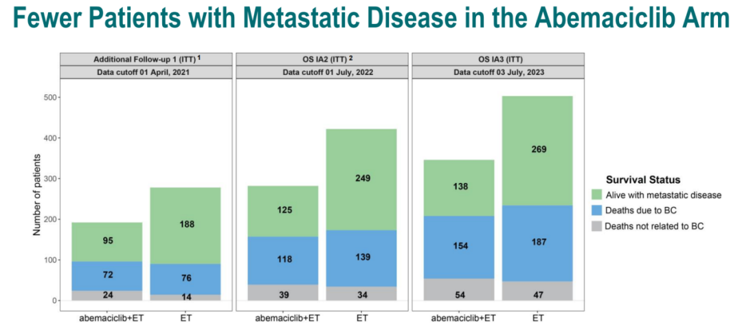数据显示,阿贝西利2年的辅助治疗可显著降低转移的风险。单纯内分泌治疗组中发生转移且存活的患者数量是阿贝西利联合内分泌治疗组的近两倍(n=269 vs.138),提示阿贝西利为HR+,HER2-高复发风险早期乳腺癌患者实现临床治愈提供了更多的可能性。