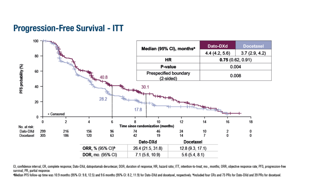 在意向治疗 (ITT) 人群中,Dato-DXd组的中位PFS显著优于多西他赛组,分别为4.4个月vs. 3.7个月(风险比[HR]为0.75;95%可信区间[CI]: 0.62~0.91; p=0.004)。