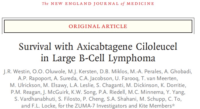 编者按:大B细胞淋巴瘤(LBCL)是一类难治性血液恶性肿瘤,包括弥漫性大B细胞淋巴瘤(DLBCL)、高级别B细胞淋巴瘤(HGBCL)、原发性纵隔大B细胞淋巴瘤(PMBCL)及滤泡性淋巴瘤(FL)3B等,约有40%左右的LBCL患者在一线治疗后仍出现复发或难治,因此LBCL的二线治疗尤为重要。近期,新英格兰期刊(NEJM)上发表了ZUMA-7研究的长期随访结果,比较了抗CD19 CAR-T Axicabtagene ciloleucel(axi-cel)与标准二线治疗(SOC)在R/R-LBCL二线治疗中的疗效和安全性,这项研究对于LBCL二线治疗的临床实践具有极其重要的意义,《肿瘤瞭望》特翻译整理了该文章并邀请中山大学肿瘤防治中心黄慧强教授进行点评解读。