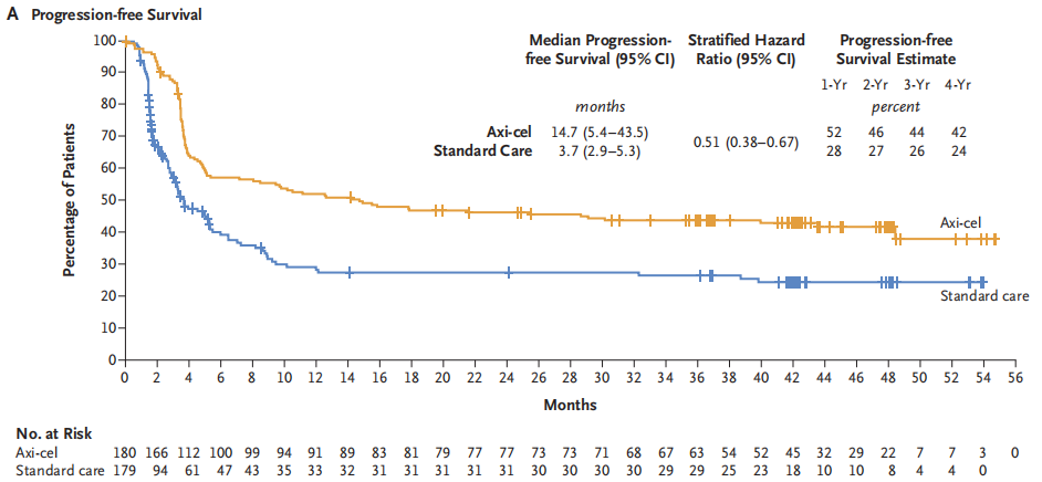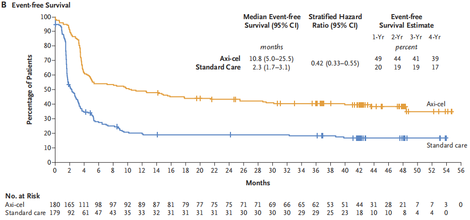 中位随访47.2个月,结果显示:①在无事件生存(EFS)方面,axi-cel组患者的中位EFS达到了10.8个月,显著优于标准二线治疗组的2.3个月,预估的4年EFS分别为38.9%vs 17.3%(HR=0.42,95%CI:0.33~0.55),详见下图。